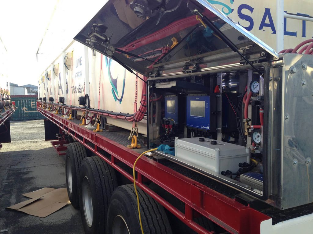 Over the past 7 years Technolab has worked with De Bruyn's to help design and install the monitoring and control system on a total of 8 Salmon Smolt transfer B-Double Transport trucks.